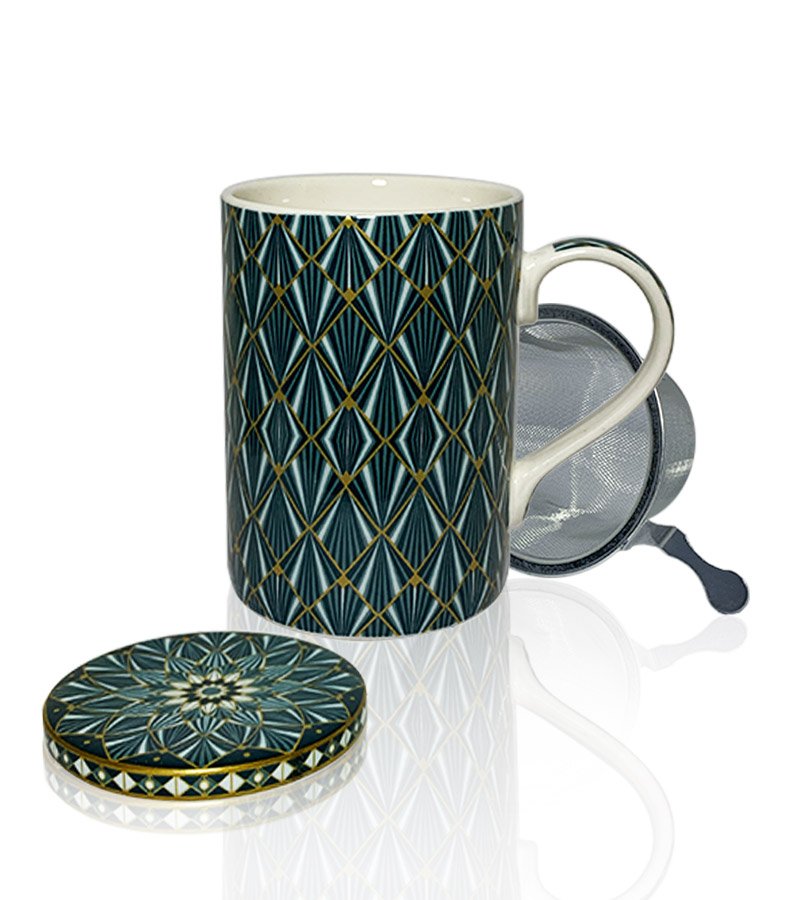 Set od dvije HERON šolje i tanjurići, dio serije GEOMETRIC, izrađen od New Bone China porcelana, odlikuje se elegantnom i prirodnom krem-bijelom bojom nježnog sjaja, kao i izuzetnom izdržljivošću. Linija je ukrašena motivom mozaičnih čaplji okruženih maštovitim narodnim cvijećem raspoređenim simetrično, u nizovima koji se ponavljaju. Ekspresivne boje tamnoplave, crvene i nježnih pastela lijepo se stapaju s bijelom pozadinom. Harmonična i prigušena estetika kolekciji daje elegantan i moderan izgled. Zahvaljujući simetričnoj strukturi uzorka, proizvodi koji ga koriste izgledaju ukusno i estetski, privlače pažnju i daju im jedinstven karakter. Šolje oduševljavaju svojim dizajnom i savršene su za svakodnevnu upotrebu i za svečanije prilike. Odlična ideja za unikatan poklon za sebe. Svakako će vam donijeti radost i podsjetiti na posebne trenutke provedene uz šoljicu aromatičnog pića.
