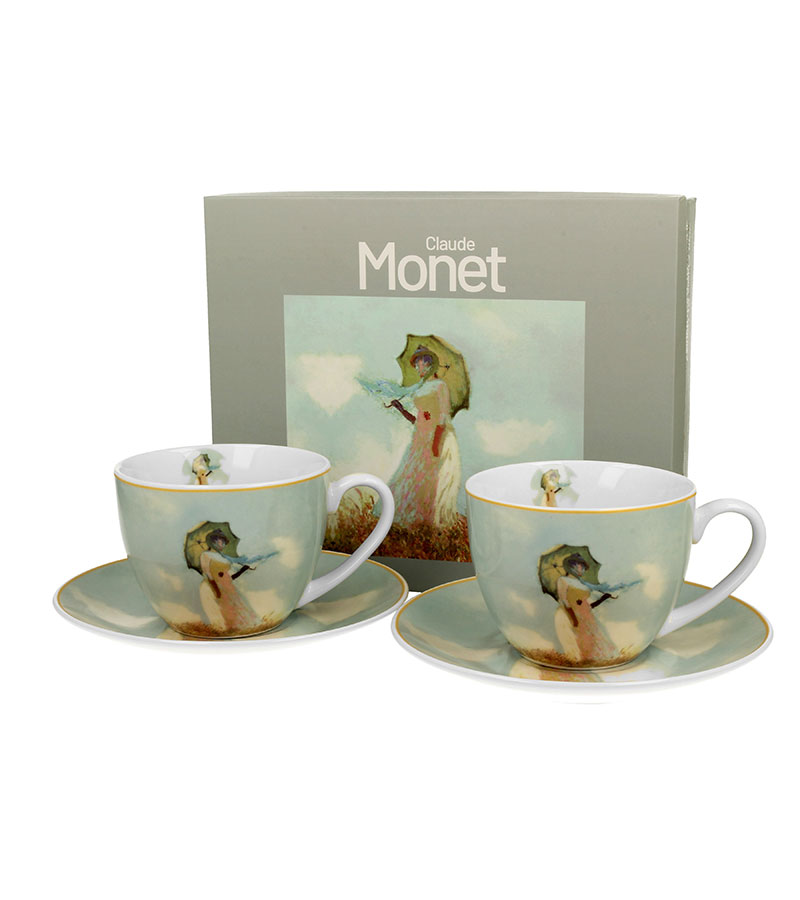 Dvije šoljice sa tanjirićima od 250 ml "Woman with a Parasol" C. Monet, dio serije Art Gallery, izrađene od porculana New Bone China, koje karakteriziraju elegantna i prirodna krem-bijela boja s nježnim sjajem kao i izuzetna trajnost. Linija je napravljena od bijelog porculana iznutra, ukrašena fragmentom reprodukcije slike "Žena s kišobranom" Claude Monet. Cijela stvar, zadržana u pastelnim bojama, prikazuje neozbiljan otvoreni zrak na kojem je umjetnik ovjekovječio suprugu i sina. Sve je upakovano u ukrasnu kutiju ukrašenu istim motivom