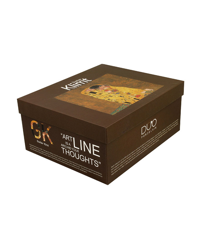 Set od dvije šolje od 250ml sa tanjirićima THE KISS Gustava Klimta iz serije Art Gallery, od New Bone China porcelana, koji karakteriše elegantna i prirodna krem-bela boja sa delikatnim sjajem, kao kao i izuzetna izdržljivost. Linija je izrađena od bijelog porculana, iznutra je ukrašena reprodukcijom slike "Poljubac" Gustava Klimta. Topla bronzana paleta u kombinaciji sa svetlucavim zlatom daje celini izuzetno elegantan karakter i zadovoljava ukuse ne samo ljubitelja slikarske umetnosti. Cijeli set u ukrasnoj kutiji ukrašenoj istim motivom odlična je ideja za originalan poklon. Slika "Poljubac" Gustava Klimta iz 1908. pripada trendu bečke secesije. Rad je nastao upotrebom zlatnih ljuskica i prikazuje par izgubljen u zagrljaju pune ljubavi, koji se naginje poljupcu. Slika pripada tzv zlatna serija koja je slikaru donela najveću popularnost.