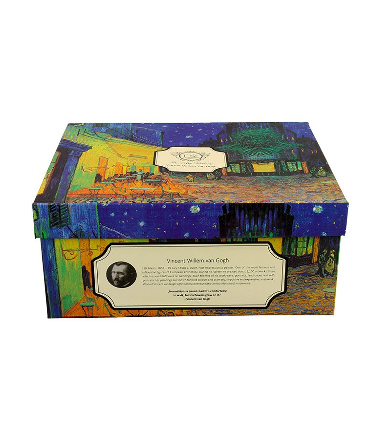 Set od dvije šolje 250 ml s tanjirićima TERASA AT NIGHT by Van Gogh iz serije Art Gallery, izrađen od New Bone China porculana, kojeg karakterizira elegantna i prirodna krem-bijela boja s nježnim odsjajem, kao i iznimna izdržljivost. Linija od bijelog porculana iznutra, ukrašena fragmentom reprodukcije slike Vincenta van Gogha "Cafe Terrace at Night". Savršena kompozicija boja koju karakteriziraju jasni kontrasti svakako je nezaboravna i izdvaja se od ostalih motiva. Sve upakirano u ukrasnu kutiju ukrašenu istim motivom odlična je ideja za originalan poklon. Slika Kavanska terasa noću iz 1888. jedno je od najznačajnijih djela u van Goghovoj karijeri - bilo je to prvo na kojem je kao pozadinu koristio temu zvjezdane noći. Slika je inspirirana umjetnikovim boravkom u Arlesu, gdje su vlasnici malog kafića postali slikarevi prijatelji. Slika se može vidjeti u Muzeju Kröller-Müller u Otterlu.
