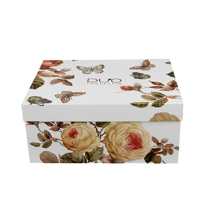 Komplet od dvije šoljice sa tanjirićima 250m.l iz serije Romantic, izrađene od porculana New Bone China, karakterizirane elegantnom i prirodnom krem-bijelom bojom s nježnim sjajem, kao i iznimnom postojanošću. Crta koju karakterizira motiv izražajnog grma ruže u pastelnim bojama. Upakovano u ukrasnu kutiju ukrašenu istim motivom, izvrsna je ideja za originalni poklon.