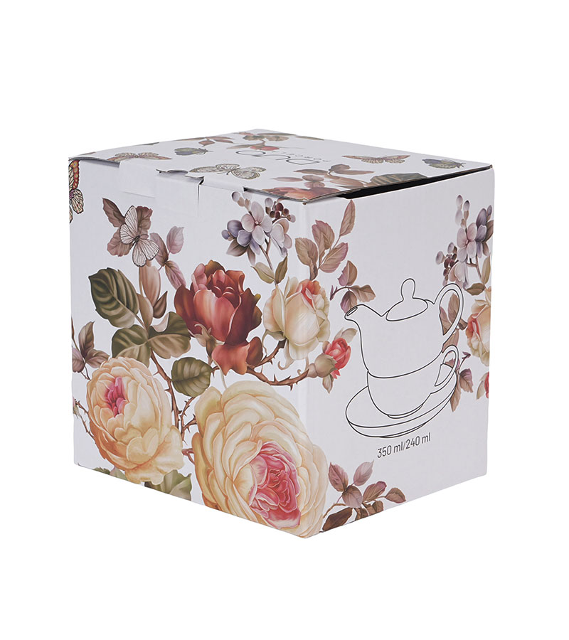 Set za jedno ZAHRA sa inox infuzerom, izrađen od porculana New Bone China, koju karakterizira elegantna i prirodna krem-bijela boja s nježnim sjajem, kao i iznimna trajnost. Crta koju karakterizira motiv izražajnog grma ruže u pastelnim bojama. Upakovano u ukrasnu kutiju ukrašenu istim motivom, izvrsna je ideja za originalni poklon.