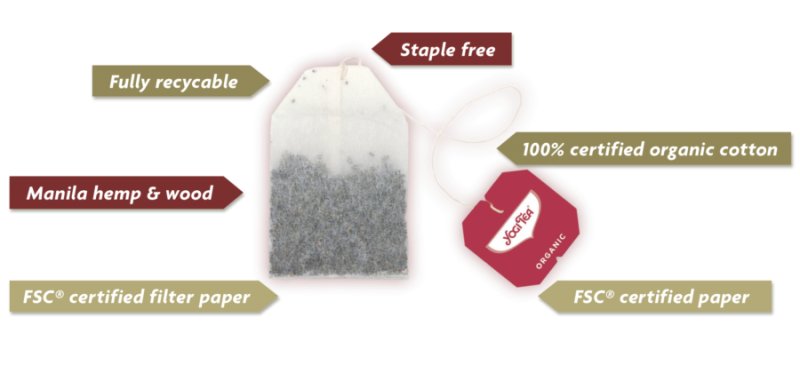 | Materijal | Čajne vrećice su biorazgradive, izbjeljene su kisikom, bez genetski modificiranog materijala i bez plastike. Sama vrećica napravljena je od konoplje iz Manile, poznate i kao Abacá, vrste banana porijeklom sa Filipina, nemaju metalne spajalice, sa 100% c |